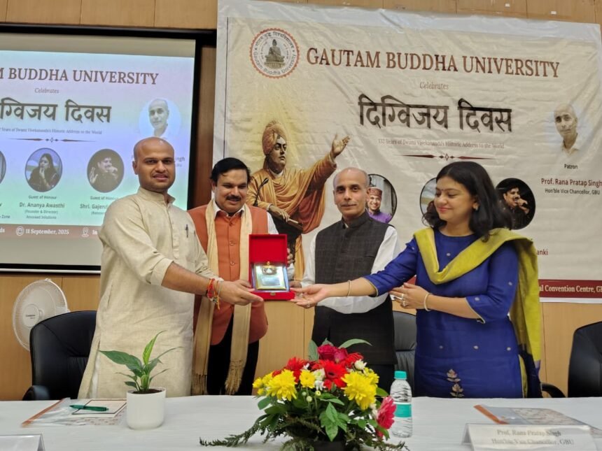 ग्रेटर नोएडा, 11 सितम्बर 2025- गौतम बुद्ध विश्वविद्यालय में ‘दिग्विजय दिवस’ बड़े उत्साह और गरिमा के साथ मनाया गया। इस समारोह के संरक्षक विश्वविद्यालय के कुलपति प्रो. राणा प्रताप सिंह रहे। विशिष्ट अतिथि के रूप में विवेकानंद केंद्र, उत्तर क्षेत्र के उपप्रमुख डॉ. निखिल यादव, अनु्वाद सॉल्यूशंस की संस्थापक निदेशक डॉ. अनन्या अवस्थी और सुप्रसिद्ध कवि श्री गजेन्द्र सोलंकी ने अपनी उपस्थिति से कार्यक्रम की शोभा बढ़ाई। इस अवसर पर सभी संकायाध्यक्ष, विभागाध्यक्ष और विश्वविद्यालय के प्रतिष्ठित संकाय सदस्य भी मौजूद रहे।